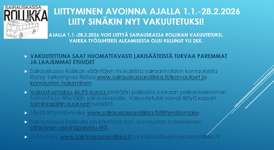 Sairauskassa Rollikan hallituksen päätöksellä kassaan liittyminen on avoinna ajalla 1.1.-28.2.2026 myös sellaisille toimintapiiriin kuuluville henkilöille, jotka eivät ole liittyneet työsuhteen alussa…